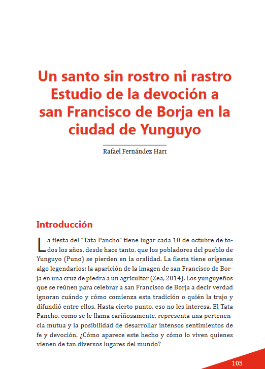 Fernández, R. (2020). “Un santo sin rostro ni rastro. Estudio de la devoción a San Francisco de Borja en la ciudad de Yunguyo”. En B. Briones & S. Castillo (Eds.), Religiosidad popular contemporánea. CLACSO.
