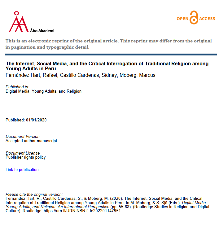 Fernández, R., Castillo, S., & Moberg, M. (2020). “The Internet, social media, and the critical interrogation of traditional religion among young adults in Peru”. En M. Moberg & S Sjö (Eds.), Digital Media, Young Adults and Religion. Routledge.