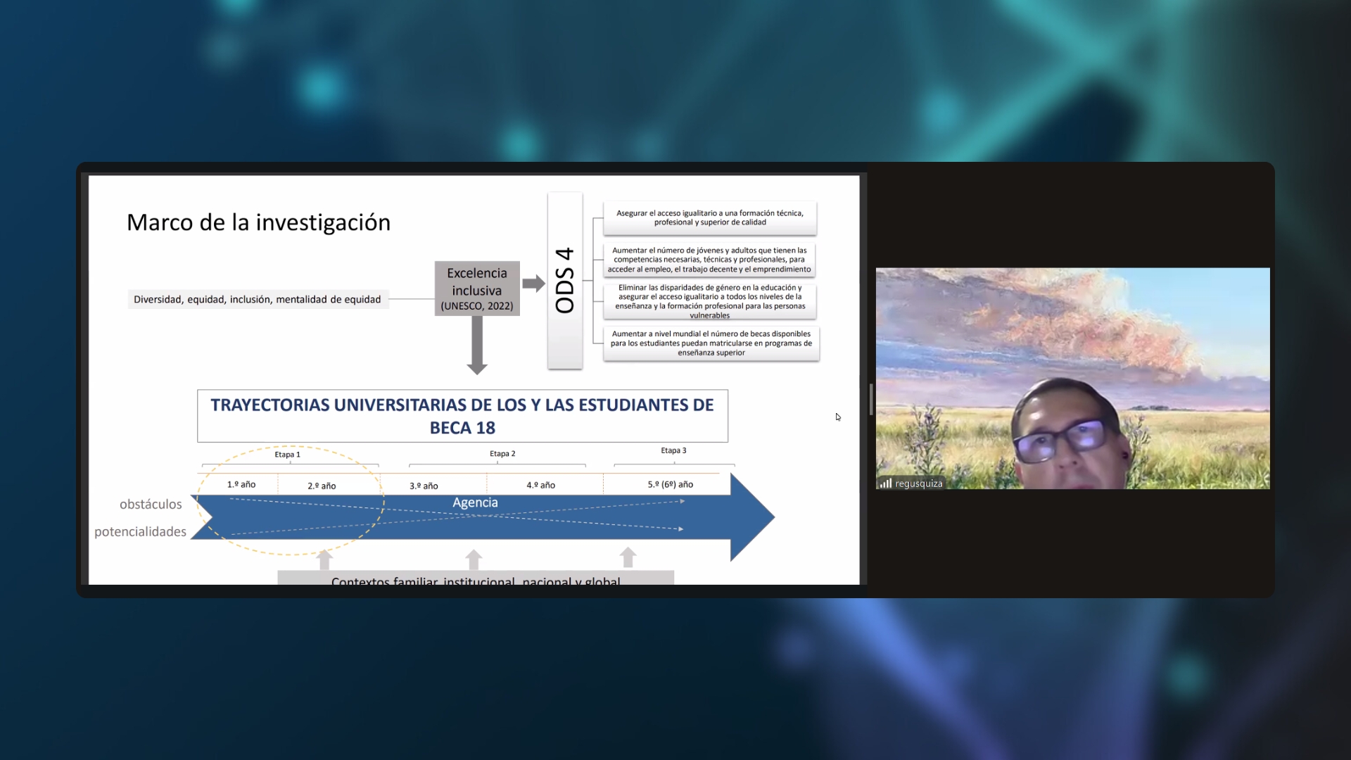 La jornada culminó con la conferencia “Acceder e iniciar los estudios universitarios: desafíos de un grupo de estudiantes del Programa Beca 18”, a cargo de los Mg. Rafael Egúsquiza Loayza y Mg. Ana María Tapia Chávez, quienes presentaron un estudio sobre las trayectorias académicas y personales de jóvenes becarios durante su ingreso a la educación superior. Los resultados mostraron que, pese a las barreras geográficas, económicas y culturales, los estudiantes desarrollan altos niveles de agencia, resiliencia y adaptación, apoyados en redes familiares y en su vocación de superación. La investigación destacó además la necesidad de políticas educativas que reconozcan la diversidad y promuevan una inclusión efectiva, garantizando que el acceso a la universidad se traduzca en éxito y bienestar sostenido.